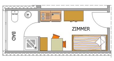 1 Wohn-Schafraum mit Einzelbett, Sat-TV, Radio, Toaster und Miniküche (2 E-Platten)